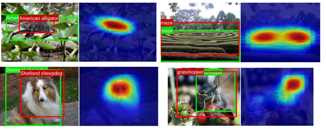이 논문에서 소개한 CAM(Class Activation Mapping) 은 CNN의 FC-Layer 대신 GAP 을 적용해 CNN 이 object localization 을 학습시킬 수 있도록 만들 수 있다. CAM 을 통해 우리는 특정 클라스들의 heat map 를 볼 수 있고, 이를 통해 네트워크가 이미지의 어느 부분을 보고 판단했는지 확인할 수 있다. CAM 이 놀라운 것은 별다른 지도학습 없이 heat map 를 만들어낼 수 있다는 것이다. 또한 CAM 결과를 보면 대부분 꽤나 놀라울 정도로 특정 클라스들의 feature 를 잘 추출해 낸다는 것을 확인 할 수 있다.