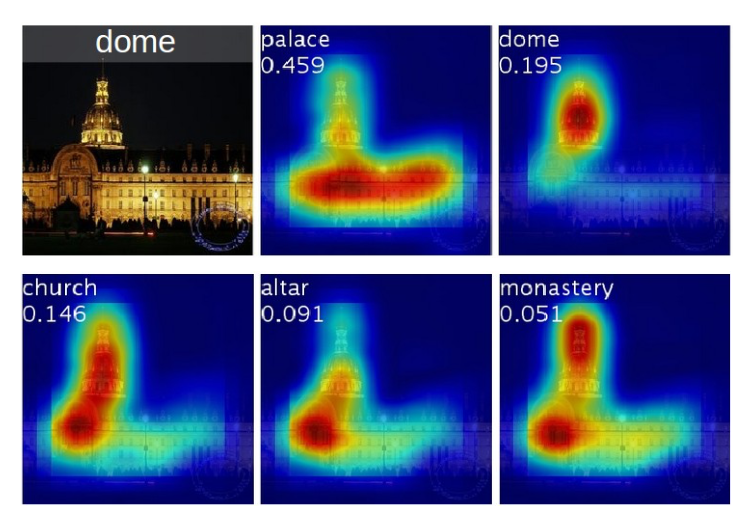 이번 논문에서는 FC-Layer 의 구조를 살짝 바꾸면서 기존에 잃었던 위치 정보들을 얻어내는 'CAM' 에 대해 소개한다. 마지막 컨볼루션을 FC-layer 로 바꾸는 대신에, GAP (Global Average Pooling) 을 적용하면, 별다른 추가의 지도학습 없이 CNN 이 특정 위치들을 구별하도록 만들 수 있다는 것이다. 위 그림을 보면 CAM 을 통해 특정 클라스 이미지의 Heat Map 을 생성할 수 있다. 이 Heat Map 을 통해 CNN 이 어떻게 그 이미지를 특정 클라스로 예측했는지를 이해할 수 있다.