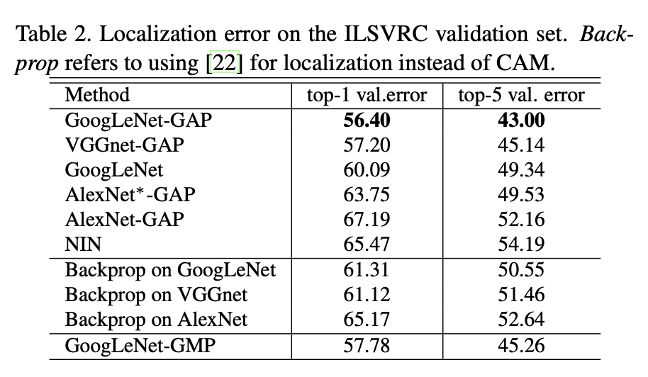 Table 2 에서 볼 수 있듯이 CAM 을 활용한 네트워크들이 다른 네크워들보다 Localization 성능이 뛰어나다는 것을 확인할 수 있다. GoogLeNet-GAP 은 top-5 에러가 43% 밖에 되지 않았는데, bounding box 에 별다른 학습을 하지 않았다는 것을 고려할 때 매우 놀라운 결과이다.
