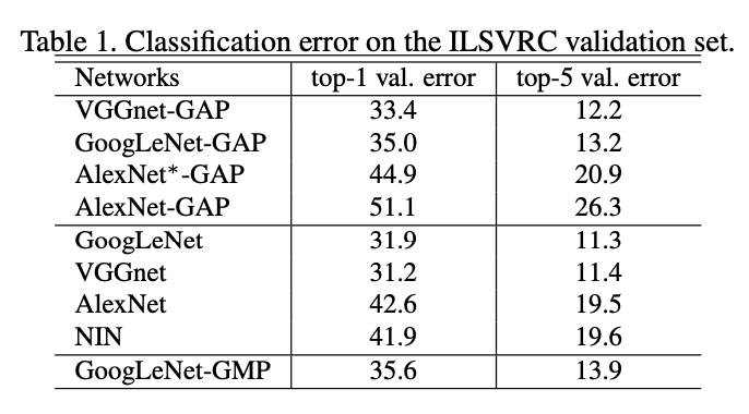 GAP 을 활용했을 때 에러가 1~2% 정도 증가하는 것을 볼 수 있다. 하지만 FC-Layer 를 전혀 사용하지 않았다는 것을 고려했을 때, 결과가 'Acceptable' 하다는 것을 볼 수 있다.